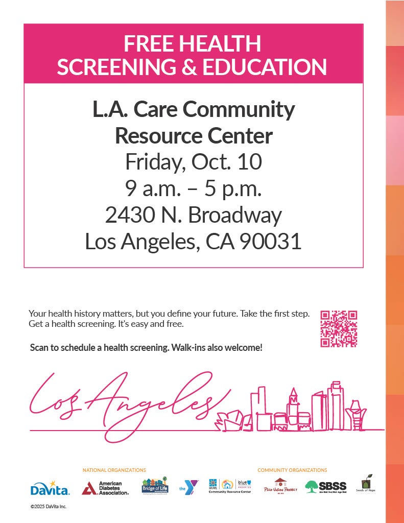 DaVita and St. L.A. Care Community Resource Center are hosting free health screenings in Los Angeles.