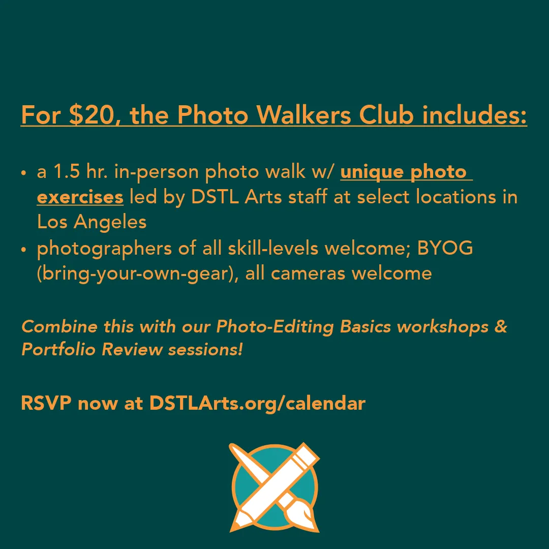• a 1.5 hr in-person photo walk with unique photo exercises led by DSTL Arts staff at select locations in Los Angeles*