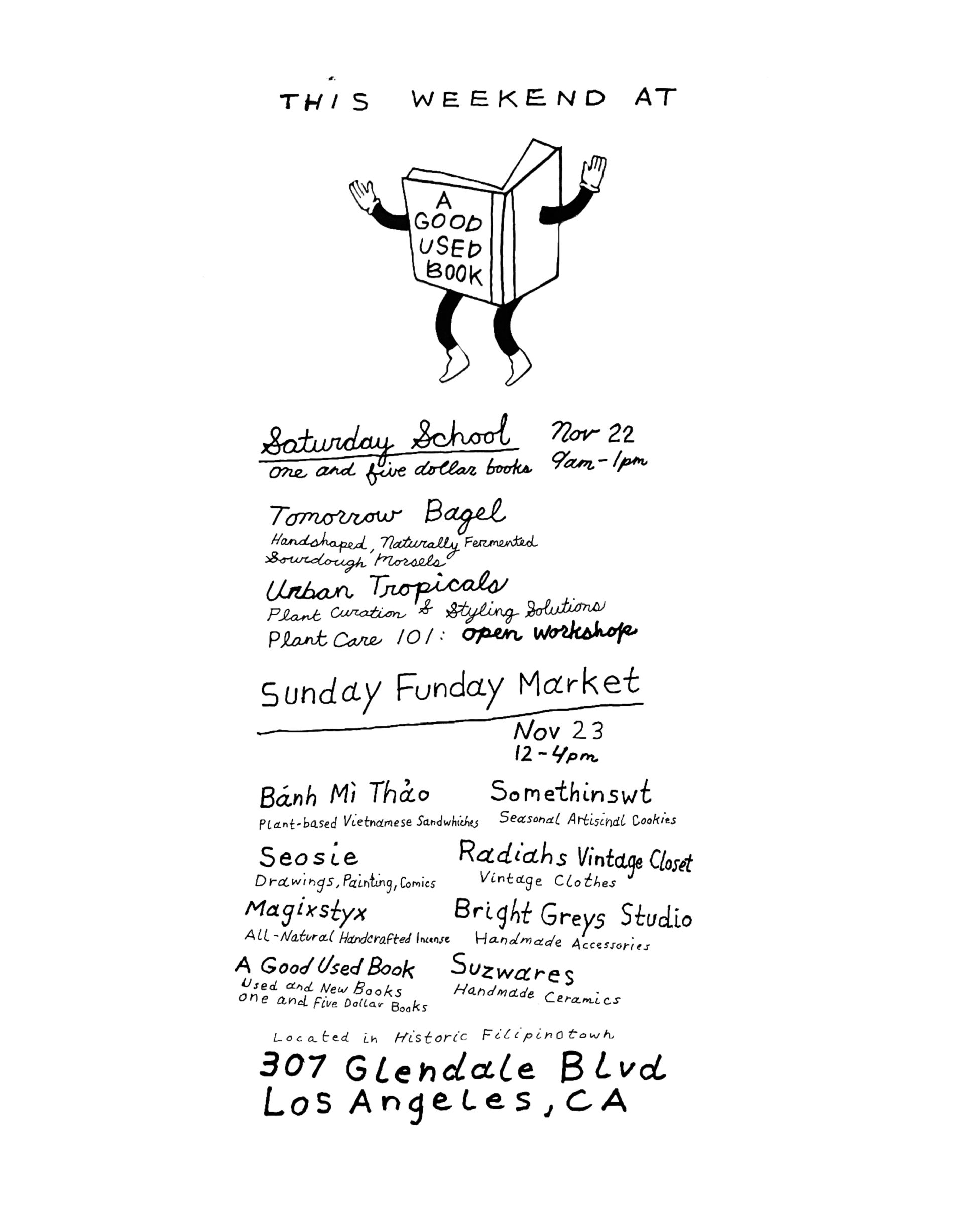 Sunday Funday Market is here at A Good Used Book! We've got an amazing lineup for you this weekend including vegan banh mi sandwiches, artisinal cookies, live drawings and comics, vintage clothing, incense, ceramics and accessories. Plus the shop is stocked with books, and refreshments are complimentary!