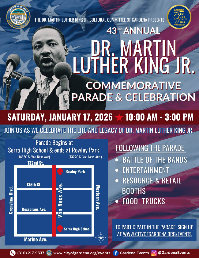 Join us on Saturday, January 17th as we celebrates the life and legacy of Dr. Martin Luther King, Jr. in the city of Gardena, at the 43rd Annual Dr. Martin Luther King Jr Commemorative Parade & Celebration. Following the parade: Battle of the bands, entertainment, resource & retail booths, food trucks and more! To participate in the parade, sign up at www.cityofgardena.org Hope to see you there.