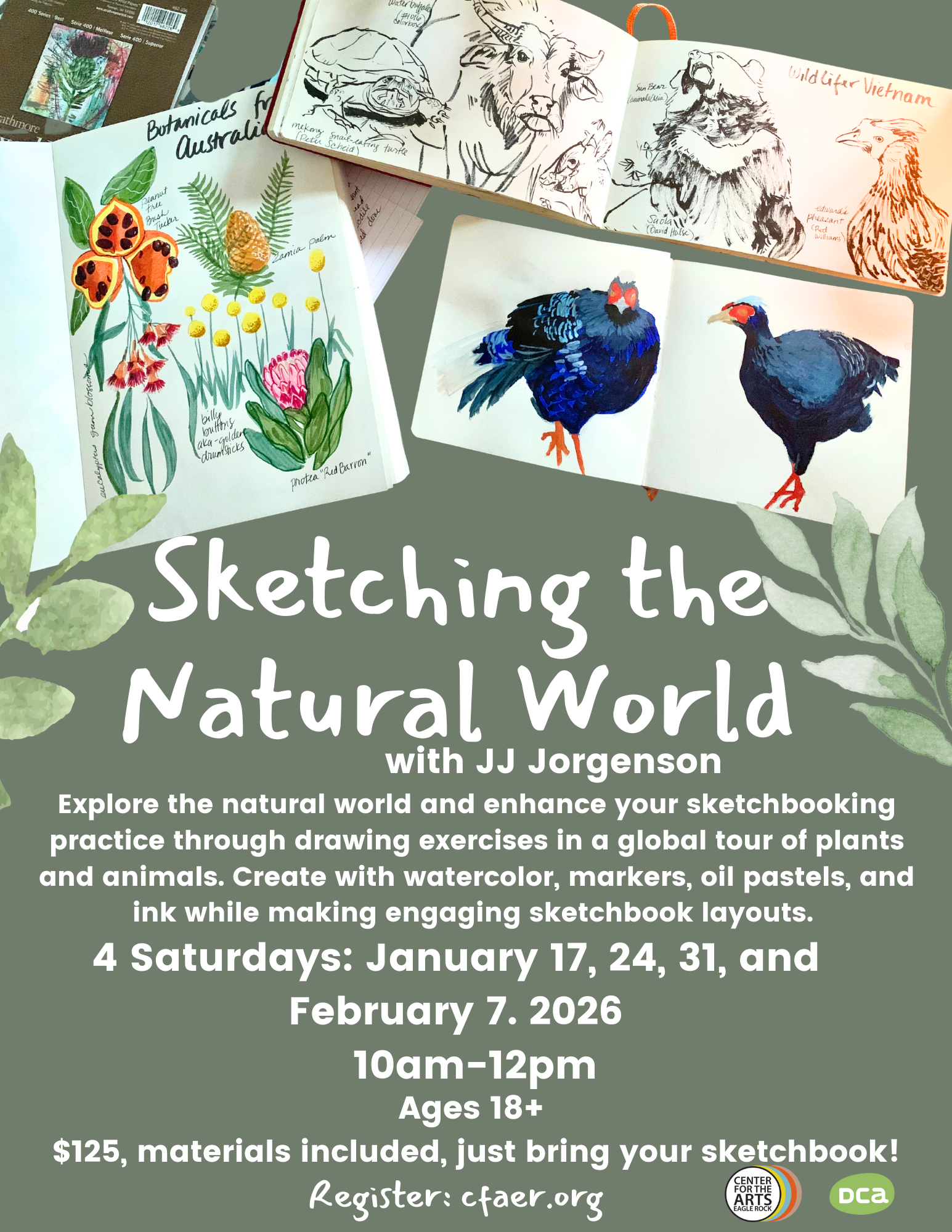 Join wildlife artist, JJ Jorgenson for a creative exploration into the natural world. In this engaging sketch book workshop, you will learn foundational art techniques and observational skills to draw realistic artworks of plants and animals from around the world. You will experiment with watercolor, inks, oil pastels and watercolor while deepening your abilities with perspective, gesture and movement in drawing. Four Saturdays, January 12, 24 & 31 and February 7, 2026, 10:00 am - noon. Just bring your sketch, all art materials are provided.